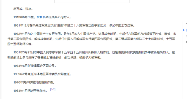 我们直接上网搜就能搜到唐连长的真实人物了,他的名字叫做唐万成,在抗日战争时期担任警卫连的连长,后来又当了营长,比起李云龙的进步速度来,他的情况虽然慢了点,但也不差,他后续当上了太行第二军分区的团长,到了解放战争时期,他直接当上了第四军分区的团长,并且后续又任命当了第九纵队27旅的副旅长。